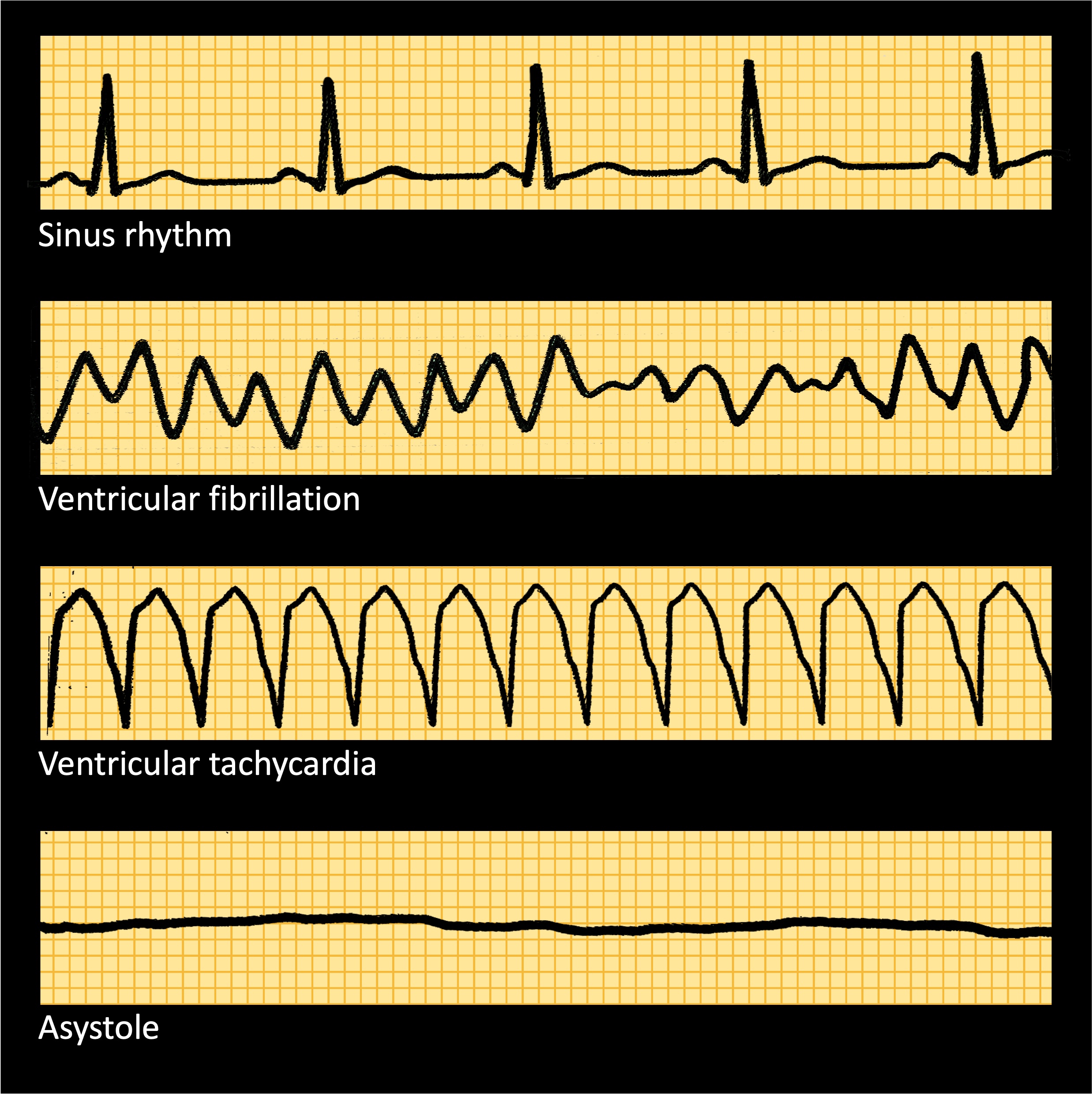 - Asystole – No electrical activity in the heart